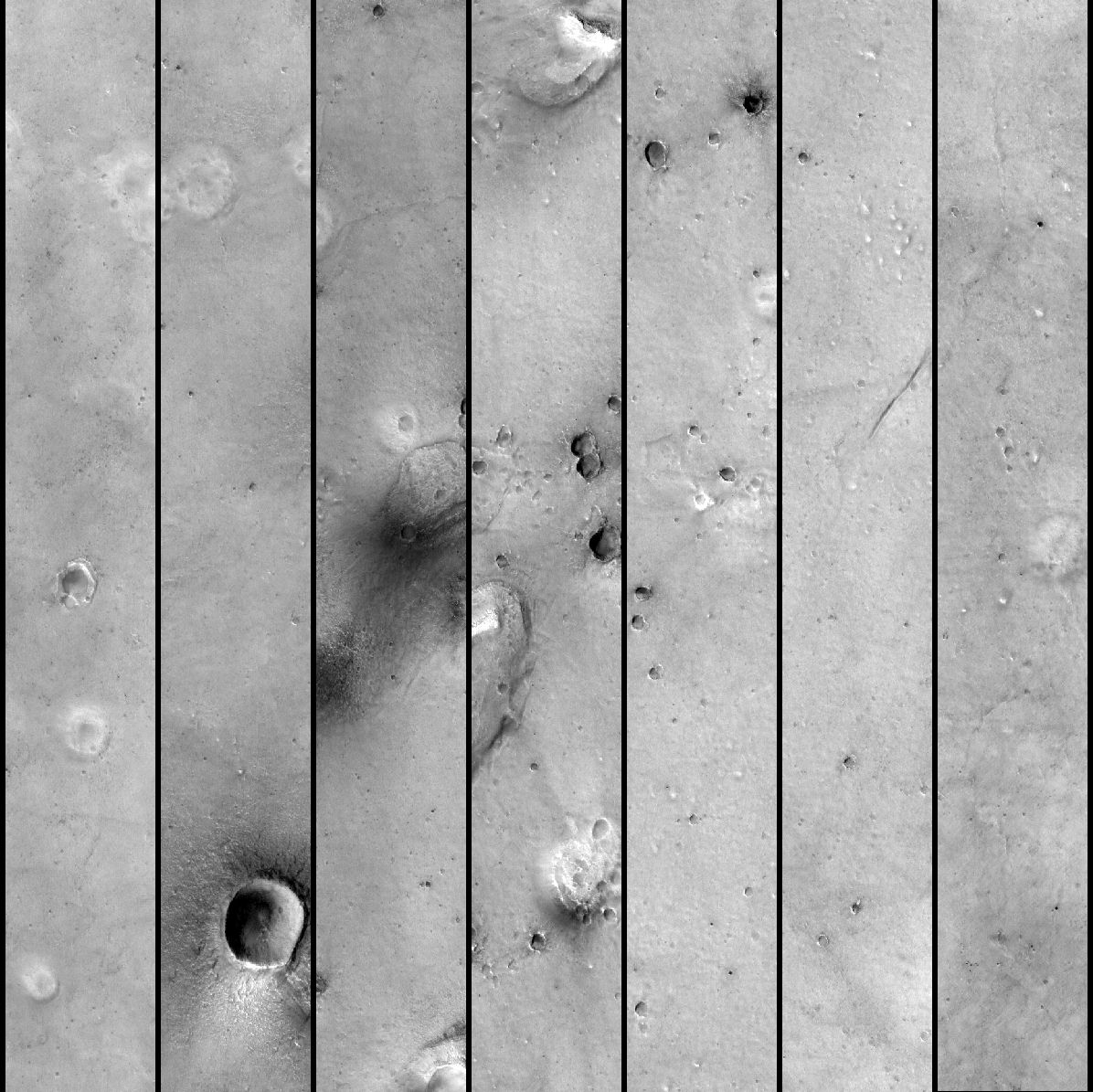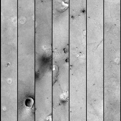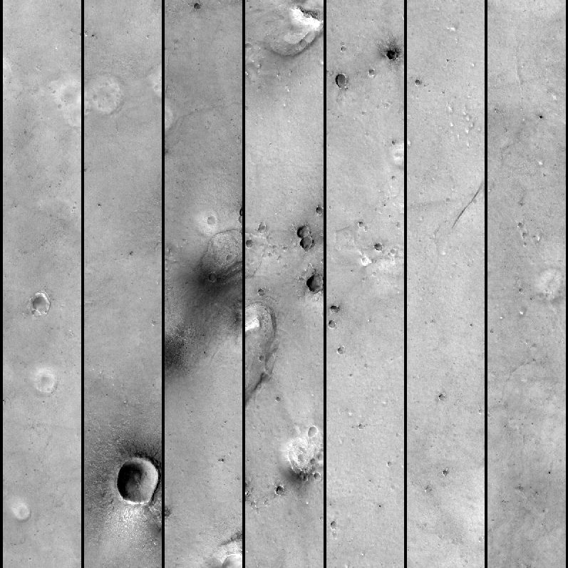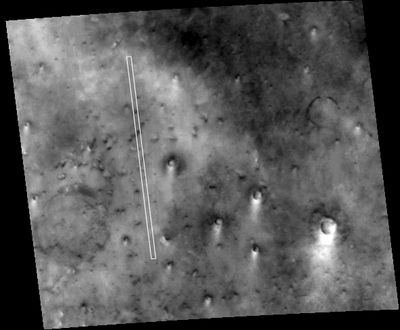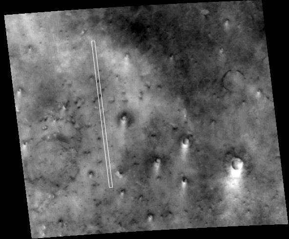 Longitude of image center: 36.85°W Latitude of image center: 39.09°N Scaled pixel width: 6.48 meters Scaled image width: 1.66 km Scaled image height: 75.60 km Solar longitude (Ls): 140.53° Local True Solar Time: 14.50 decimal hours Emission angle: 18.03° Incidence angle: 40.32° Phase angle: 49.19° North azimuth: 93.77° Sun azimuth: 339.03° Spacecraft altitude: 414.44 km Slant distance: 433.36 km |